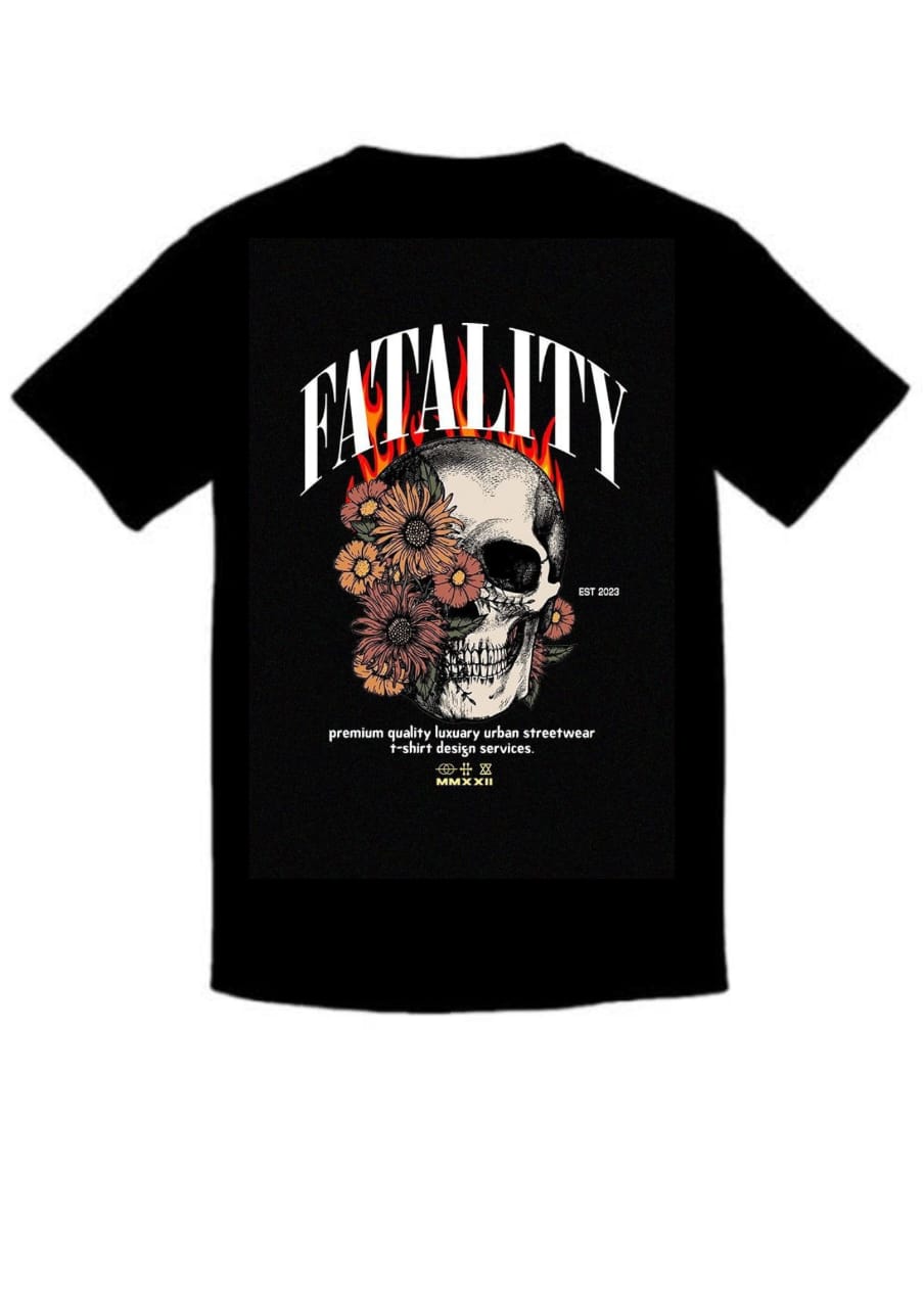 Redefine bold streetwear with this premium black oversized T-shirt that merges dark artistry with modern luxury. The back features a striking skull design entwined with vibrant flowers, framed under the commanding word “FATALITY” ignited with flames—symbolizing both strength and rebirth. This powerful artwork creates a perfect balance of edgy street style and refined detail, making it a standout piece in any wardrobe.
